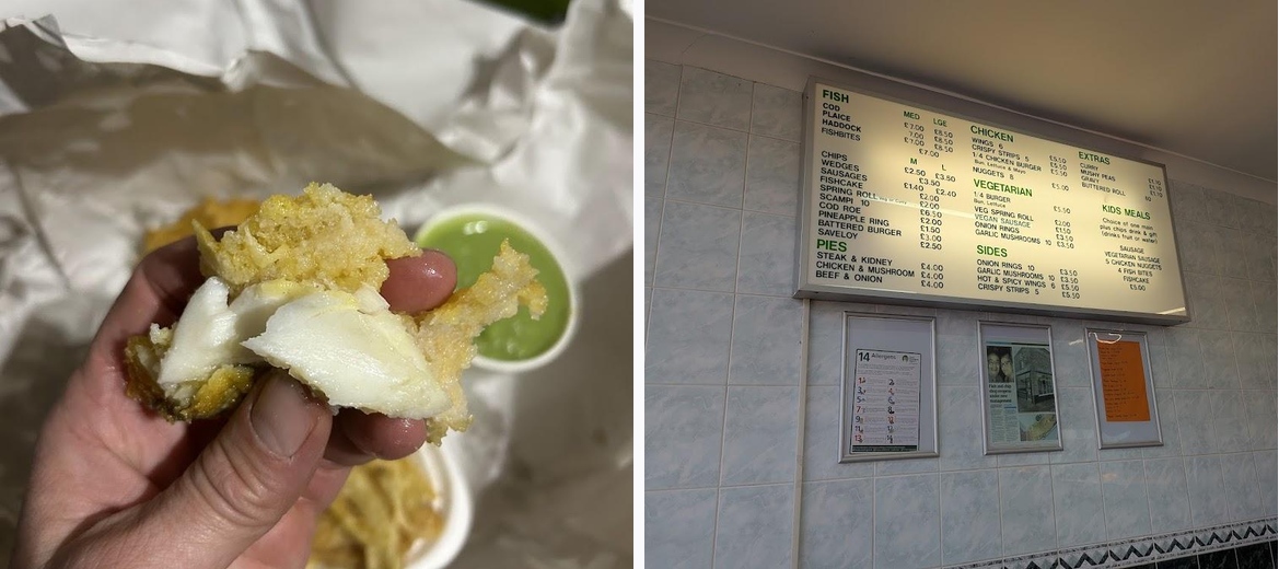 Popped last night having driven over from Manchester. Best fish and chips I've had in years. Fish was fried to perfection. Chips beautiful. Peas great. Friendly staff. Great value. Just a pity I had to eat em in my car! Thanks for a great meal.